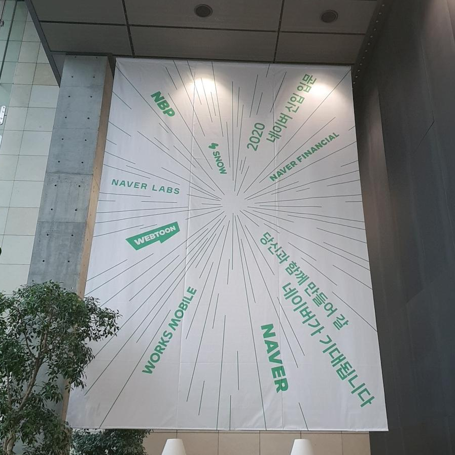 올라가자마자 신입 입문 프로그램 현수막이 눈에 띄었다. 네이버의 각 계열사들의 로고와 "당신과 함께 만들어 갈 네이버가 기대됩니다"라는 멘트가 멋졌다. 행사장에서도 HR&Culture 부서에서 준비해주신 여러 요소들을 보면서 얼마나 오래 준비했을까 대단하다는 생각이 들었다.