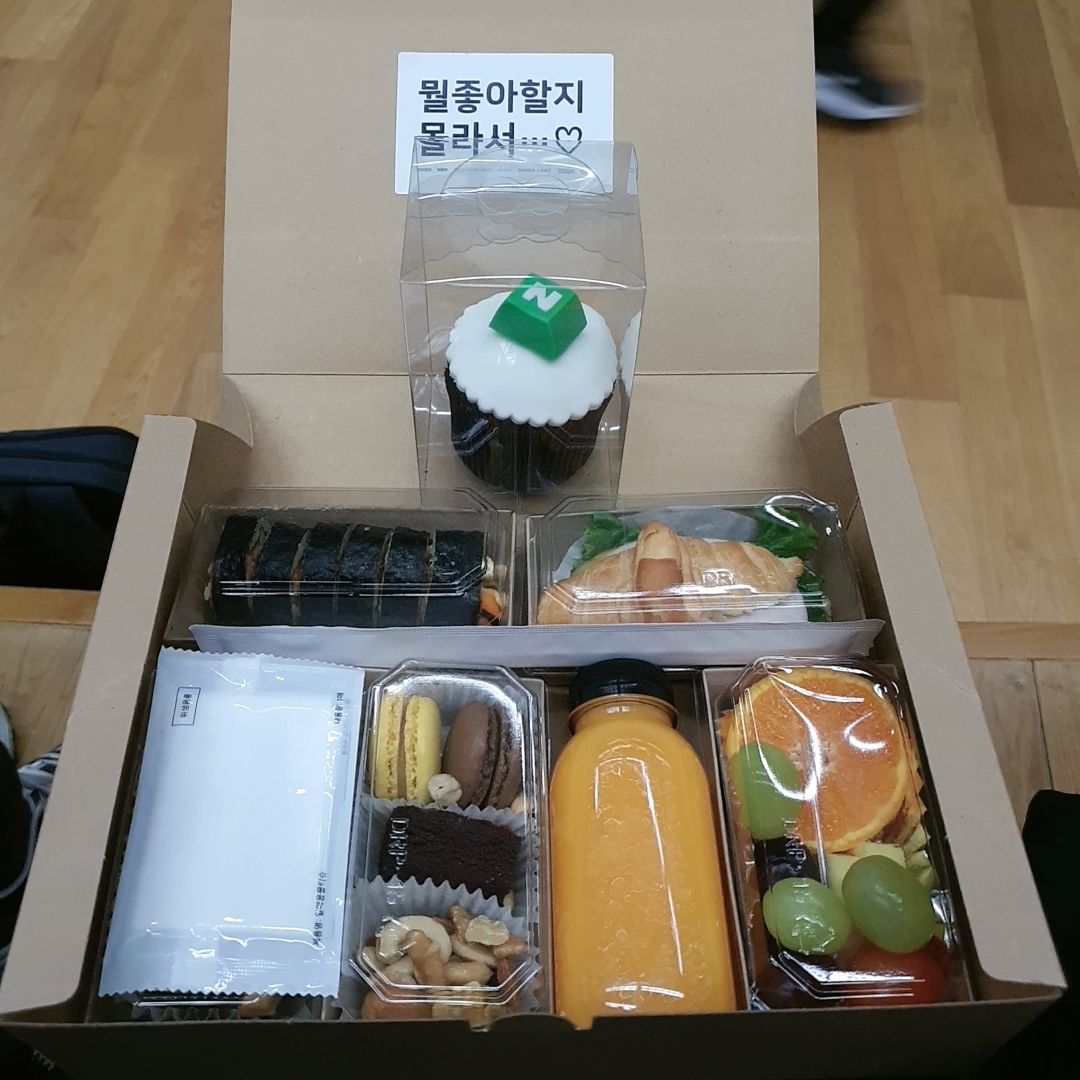 신입 입문 프로그램에 대한 소개를 듣고 간식이 나왔는데, 거의 식사 수준으로 나와서 결국 다 먹지는 못했다. 멘트 그대로 뭘 좋아할 지 모르라서... 다 넣은 느낌이었다. 위에 있는 네이버 머핀도 깨알 같았다. 맛은 없었지만...