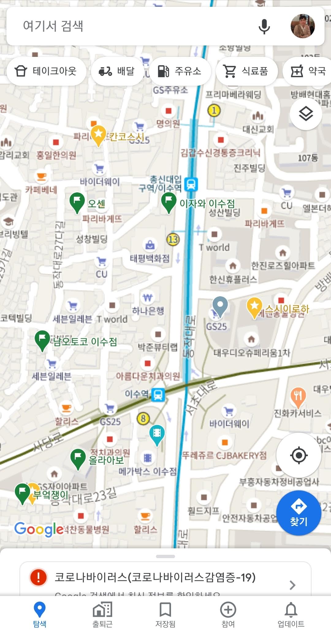 구글에 자주 붙여지는 수식어는 글로벌 IT 공룡이다. 그만큼 여러 나라에 퍼져있고 매우 거대하다. 구글 지도는 코로나와 관련해서 글쓴이가 생각하기에 굉장히 놀랍고 멋진 방법으로 대응하고 있다. 바로 지도에서 찾고자하는 가게의 우선순위를 바꾼 것이다. 구글 지도에서 특정 지역을 검색 후 주변의 찾고자하는 가게를 보여줄 때 가장 먼저 보여주는 것이 음식점, 카페 순이였다. 사용자들이 지도앱을 사용하는 주된 목적을 생각하면 당연한 결정이다. 하지만 코로나 시국이 되면서 구글 지도앱은 다음과 같이 바뀌었다.