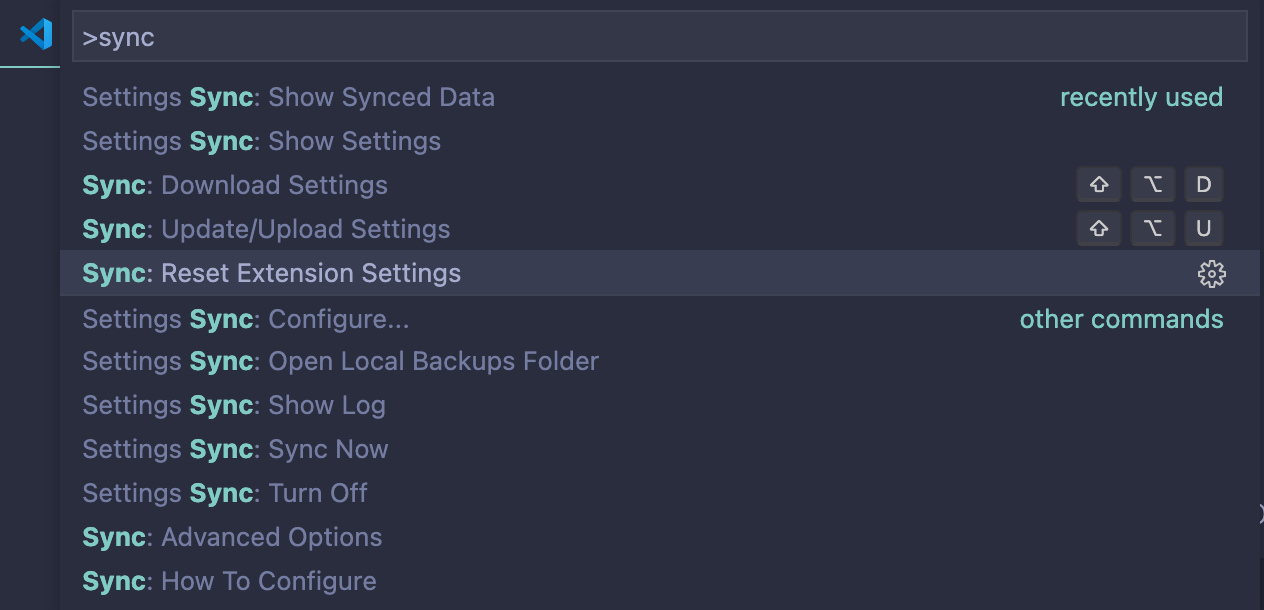 여기에서 기존에 VSCode에 정보가 있다면 "Sync: Reset Extension Settings" 를 통해 삭제하도록 한다.