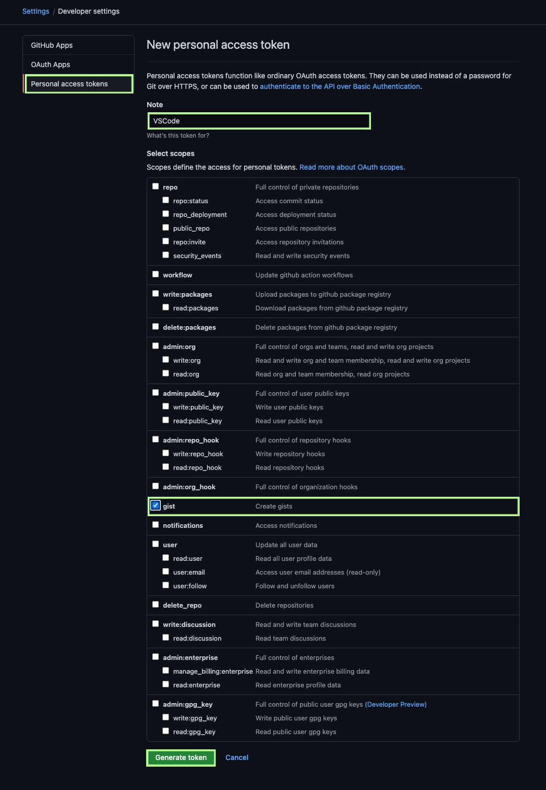 Settings Sync는 VSCode의 설정 정보들을 Github의 gist에 저장한다. 따라서 나의 Github에서 gist를 생성할 수 있는 토큰을 만들어야한다. 토큰을 생성하기 위해서는 "Github > Settings > Developer Settings > Personal access tokens" 로 들어간다.