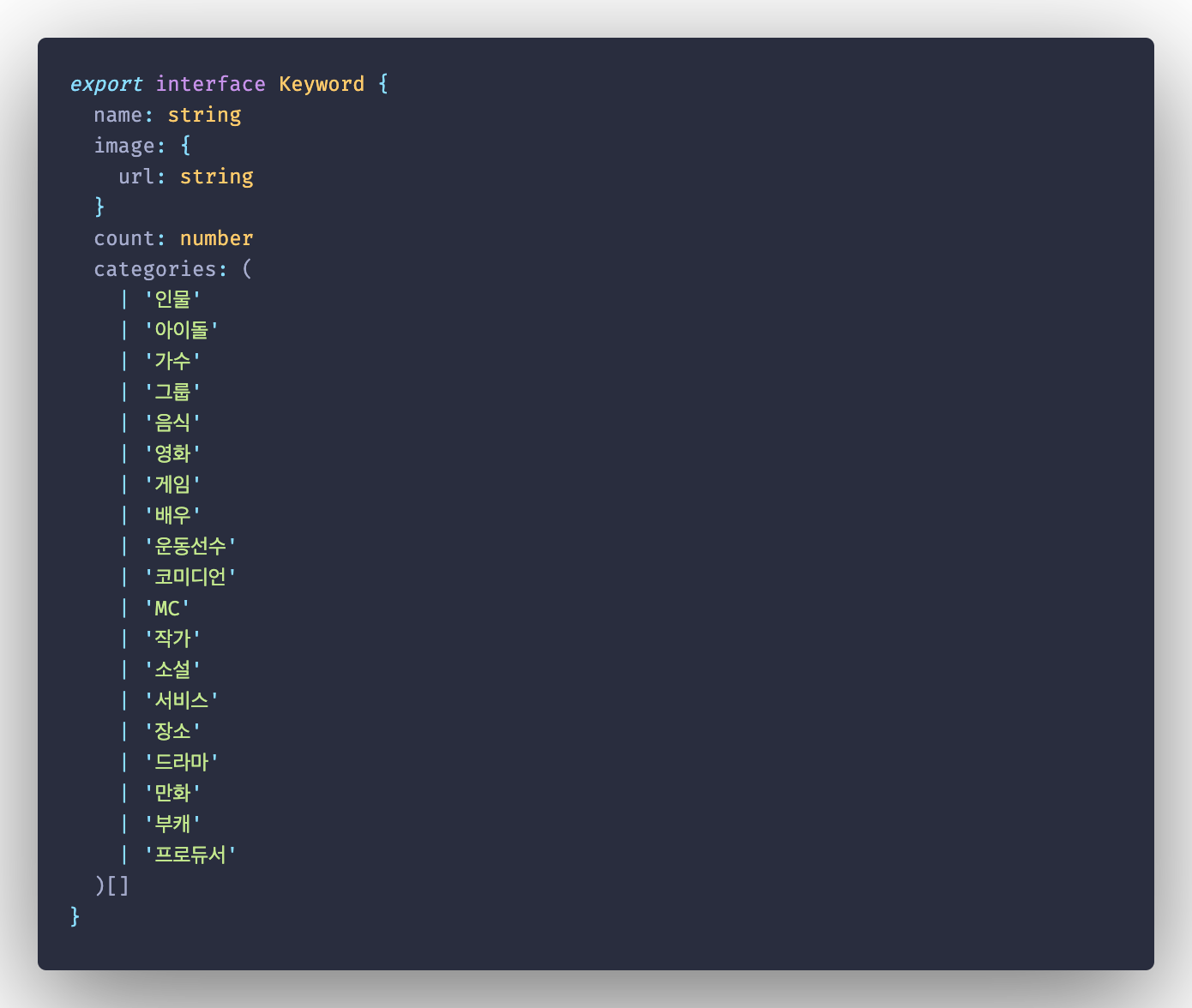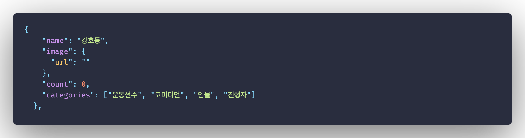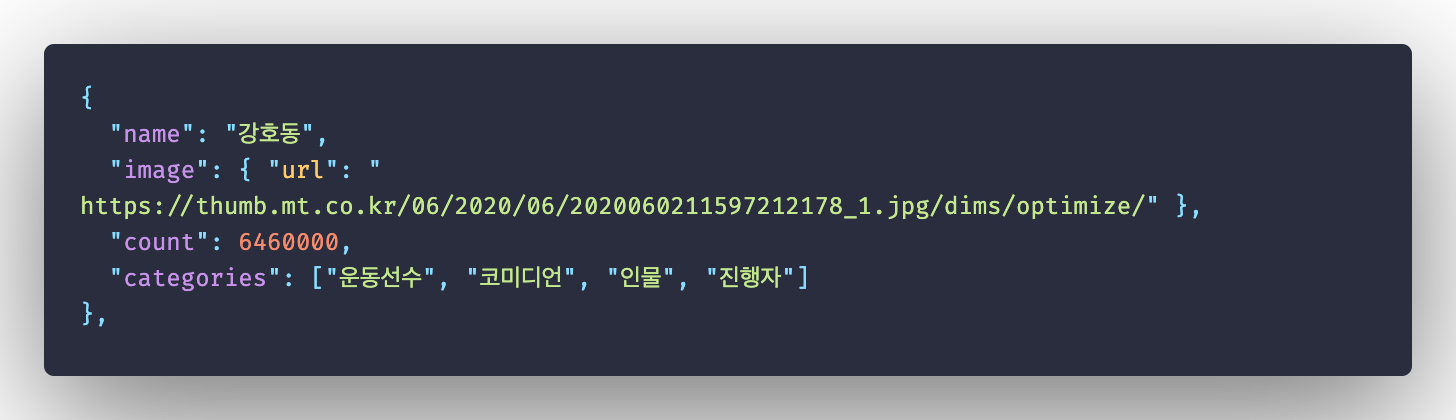 여기에서 키워드명과 카테고리 목록은 수작업으로 넣고 검색량(count)과 이미지 주소(image.url)는 크롤링을 통해 해결할 예정이다.