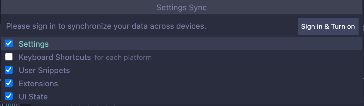 해당 버튼을 누르게되면 VSCode의 어떤 요소를 동기화할 것인지 선택하는 창이 뜨게 된다. 각 요소들은 다음과 같다.
