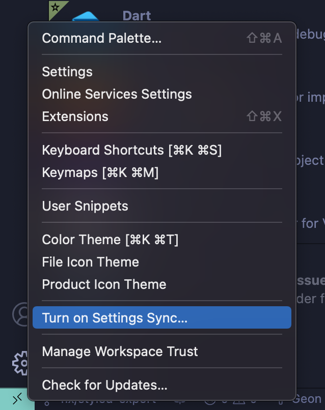 우선 동기화를 위해 VSCode 왼쪽 아래 톱니바퀴(설정) 버튼을 누르고 Turn on Setting Sync를 누르자