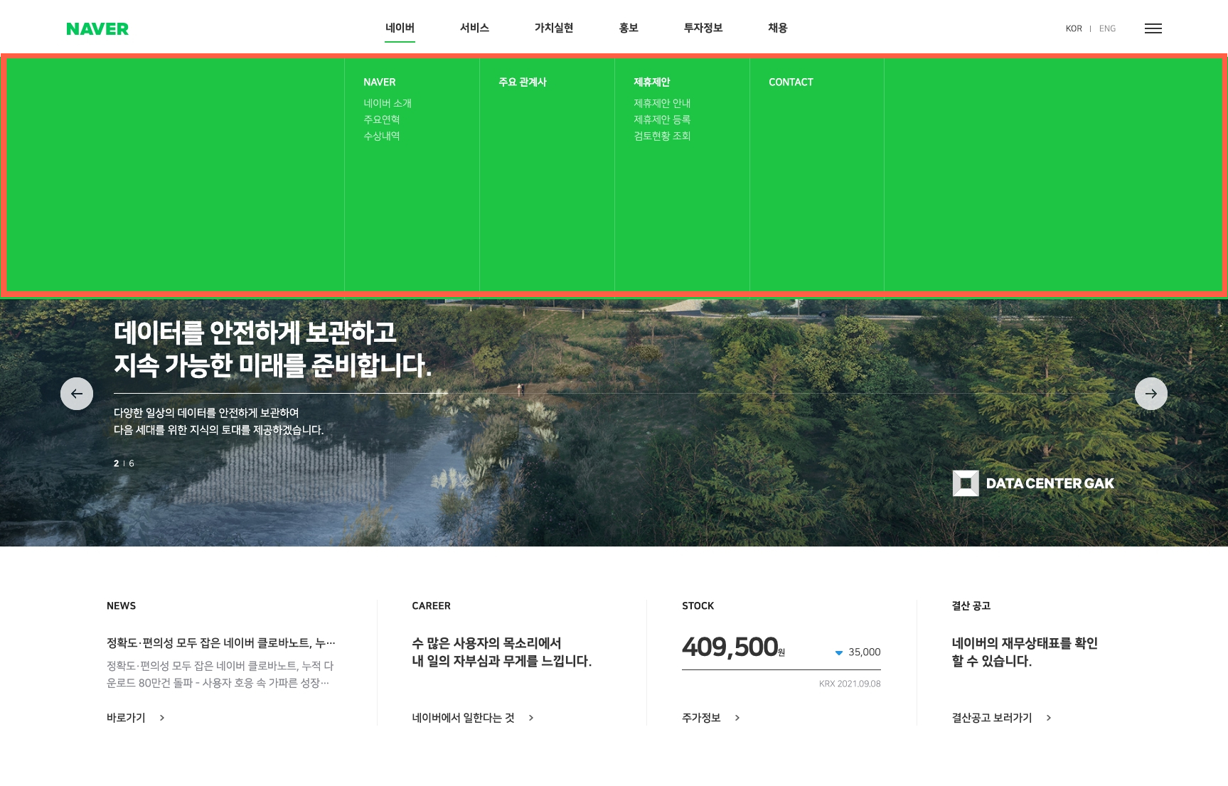 - 메인 메뉴 - 대분류 메뉴라고도 하며, 주요 페이지 링크 버튼 역할을 하거나 호버시 서브 메뉴를 볼 수 있는 버튼 역할을 한다. 서브 메뉴가 있는 경우 클릭시 메인 서브 메뉴로 가는 링크 역할을 하기도 한다.