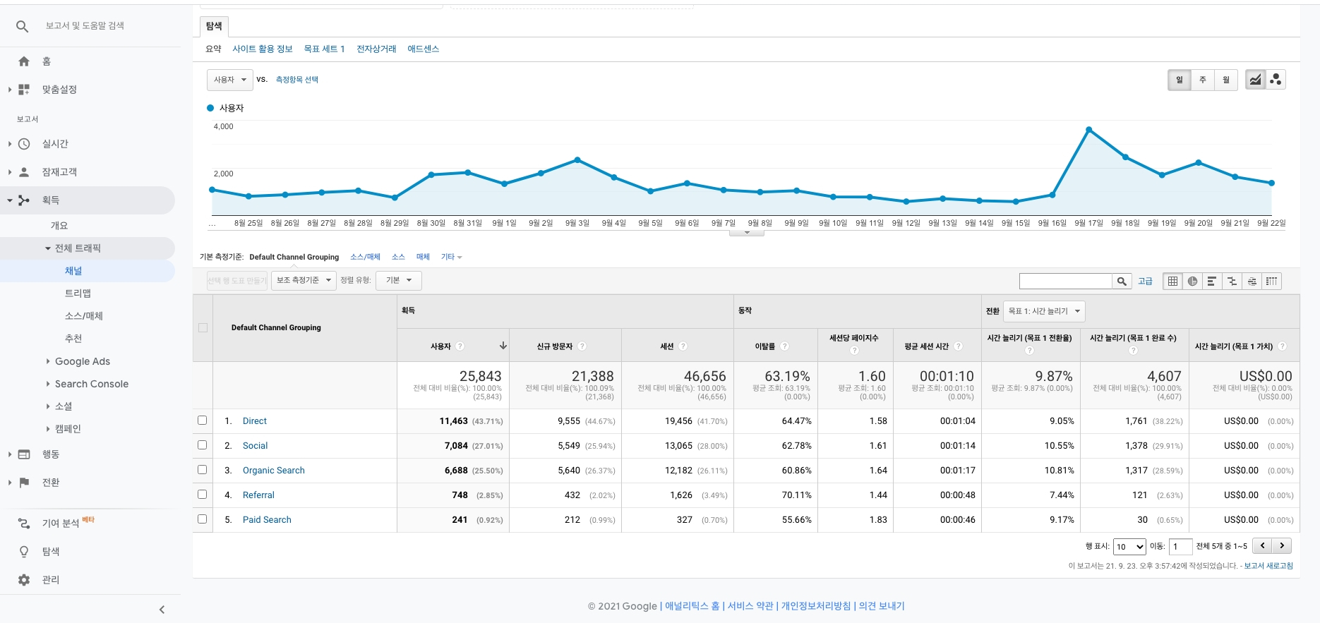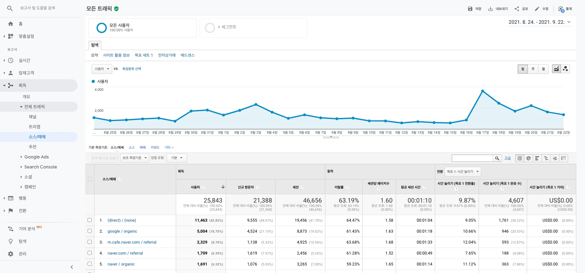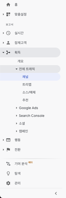 구글 애널리틱스 > 획득 > 전체 트래픽