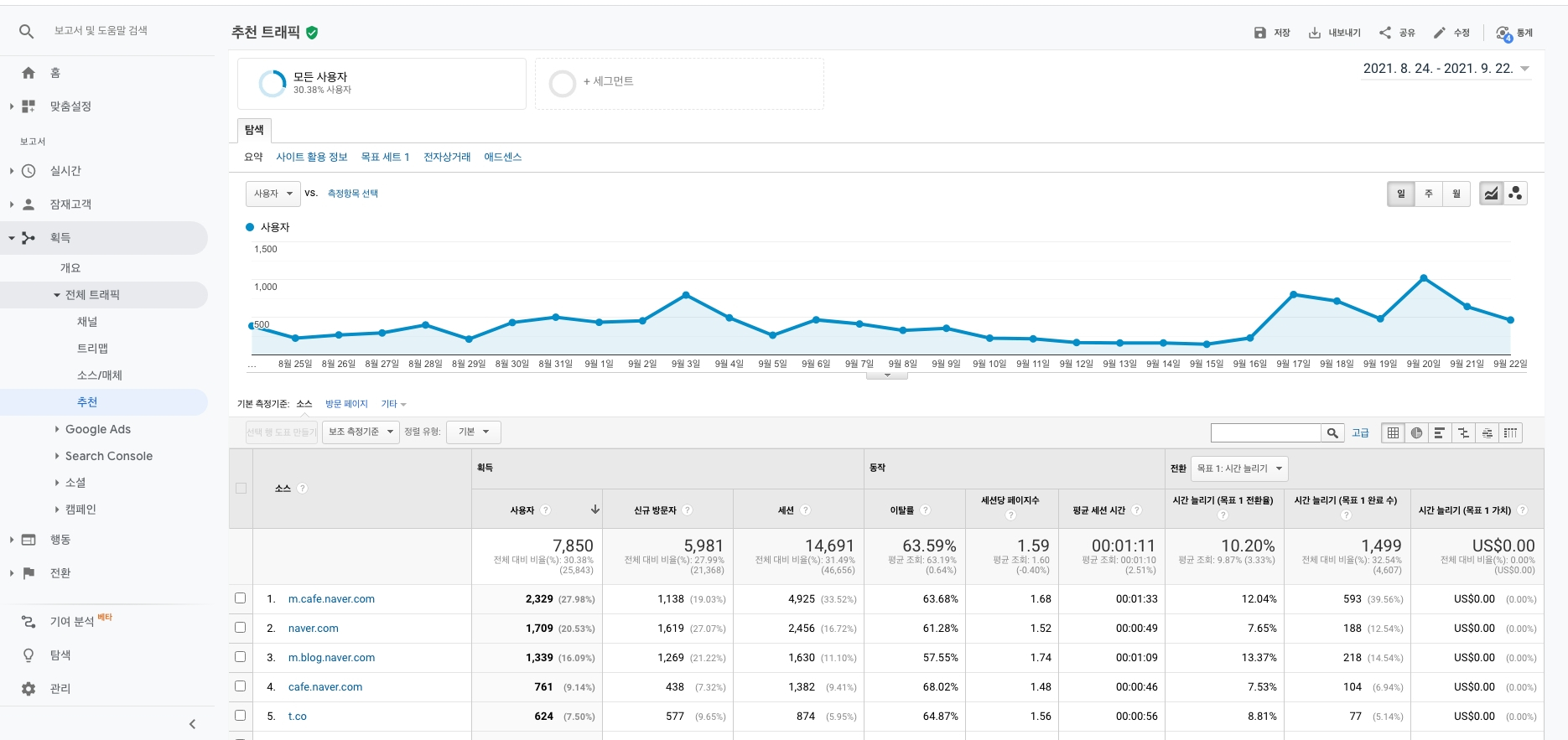 추천은 소스/매체의 트래픽 중 Referral에 해당하는 트래픽만 보여주는 페이지이다.