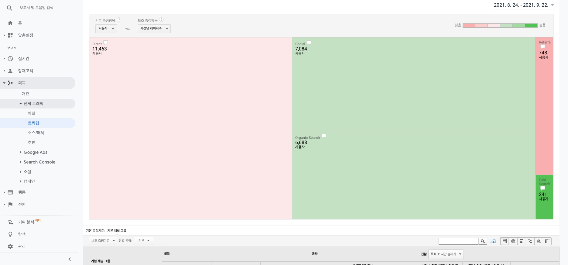 전체 트래픽 > 채널과 보여주는 데이터는 같지만, 트리맵을 활용하여 시각적으로 한 눈에 파악할 수 있도록 한 페이지이다. 오른쪽 위의 색은 녹색에 가까울 수록 세션당 페이지수가 높다는 뜻으로 즉, 해당 채널을 통해 들어온 트래픽의 사용자가 사이트에 더 많이 머문다는 것을 의미한다. 이를 통해 녹색에 가까운 트래픽을 높여야겠다는 결과를 도출할 수 있다.