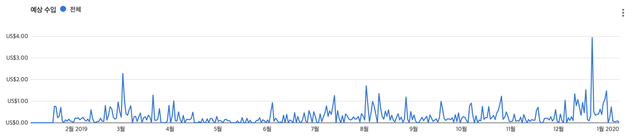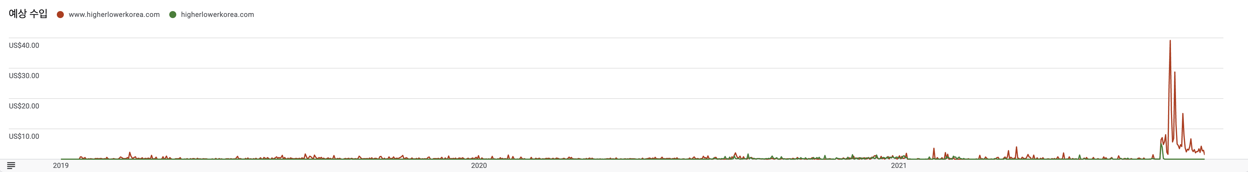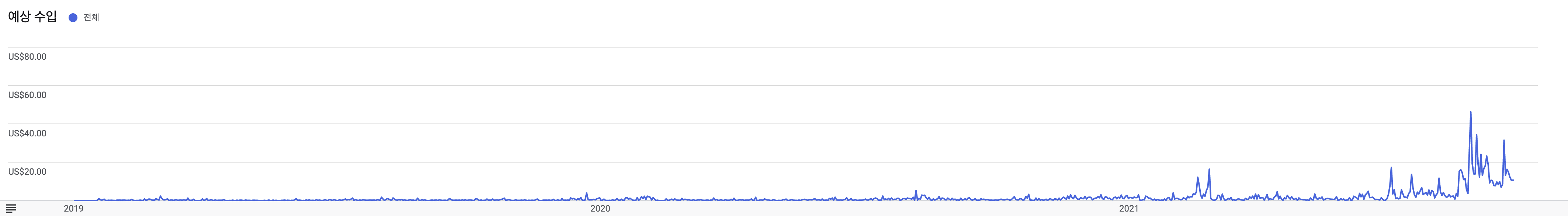 그래프에서 특징적인 부분을 찾아보자면 주기적으로 크게 솟구치는 부분이 보인다. 해당 사이트는 모바일 게임의 팬 사이트이다보니, 주로 유저들이 해당 게임의 카페나 포럼에 몰려있는 업데이트일, 점검일에 유저들이 몰리게되었다. 해당 사이트에서 가장 수익이 많이 난 날은 21년 9월 17일로 총 $28.96이고, 총 수익은 $526.82이다. 현재는 더 많이 더 적게보다 적게 벌었지만, 운영한 시간을 비교하면 굉장히 준수한 성적이다.