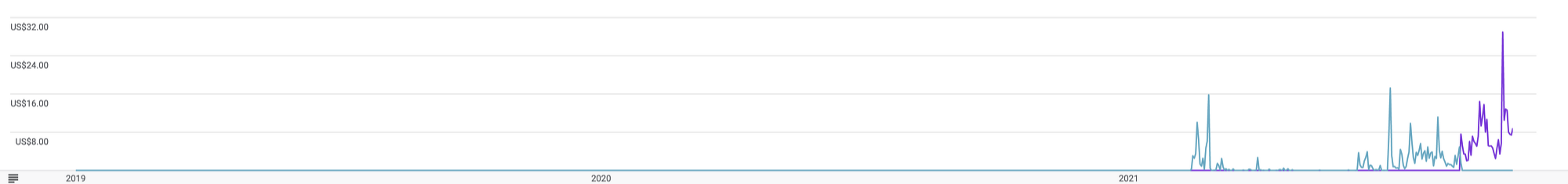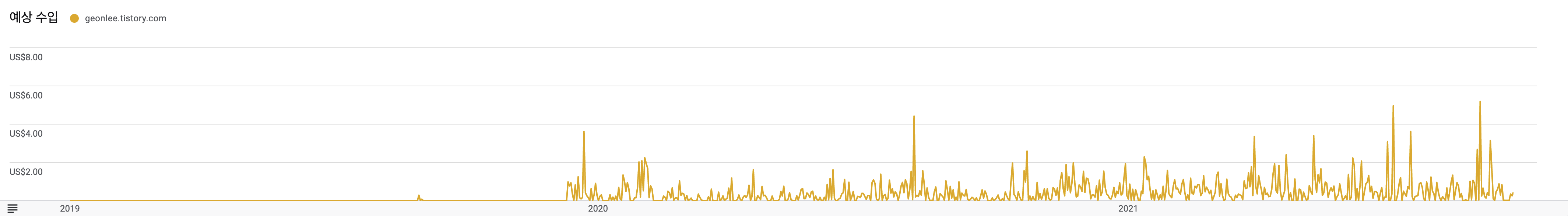 위의 그래프는 이전 글에 사용했던 2019.01 ~ 2020.01까지의 애드센스 그래프이고, 아래 그래프는 2019.01 ~2021.09까지의 애드센스 그래프이다. 비교해서 보면, 2019.01 ~ 2020.01의 그래프에서 보였던 $4짜리 피뢰침은 이제 잘 안보일 정도이다. 2021년 들어오면서 사이드 프로젝트가 중박정도 치면서 이전 못지않은 수익을 가져다주고 있다. 가장 수익이 많이 난 날은 21년 8월 25일로 총 $46.22이고, 총 수입은 $1,378.89 로 환전하면 약 162만원이다.