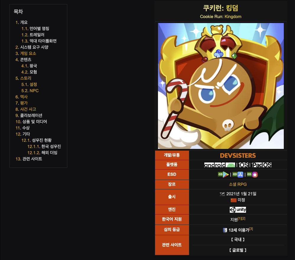 TOC는 목차(Table Of Content)라는 뜻으로 웹 문서에서는 헤더 태그들을 모아서 계증화하여 보여주고, 클릭 시 해당 헤더 태그로 자동으로 이동해주는 역할을 하는 부분을 뜻한다. TOC를 아주 잘 사용한 사이트로는 나무위키가 있겠다. 나무위키는 설명하고자하는 내용이 계층화되어 있어서 이를 자동으로 목차화해준다. 그리고 위에 언급한 것처럼 클릭시 해당 헤더 태그로 이동하게 된다.
