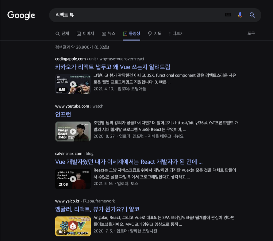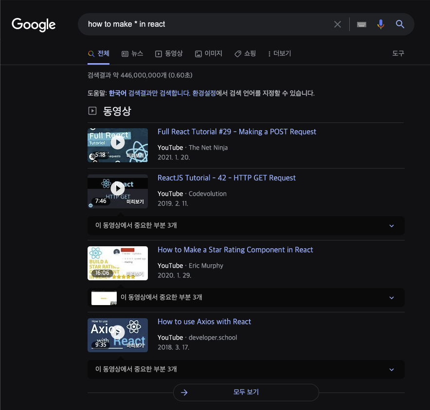 글 검색을 했을 때 원하는 결과가 나오지 않았다면, 유튜브 비디오 검색을 통해 원하는 정보를 얻을 수도 있다. 신기한 기능인데, 구글에서 유튜브 영상의 음성을 분석하여 해당 키워드가 영상에 등장한다면 해당 영상을 유튜브 비디오 검색 결과에 보여준다. 추가적으로 필자는 글보다 유튜브 영상을 선호하는 편인데, 특히 튜토리얼 같은 내용들은 글보다 영상을 통해 정보를 얻는게 더 효과적이다.