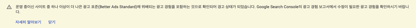 운영 중이신 사이트 중 하나 이상이 더 나은 광고 표준(Better Ads Standard)에 위배되는 광고 경험을 포함하는 것으로 확인되어 경고 상태가 되었습니다. Google Search Console의 광고 경험 보고서에서 수정이 필요한 광고 경험을 확인하시기 바랍니다.