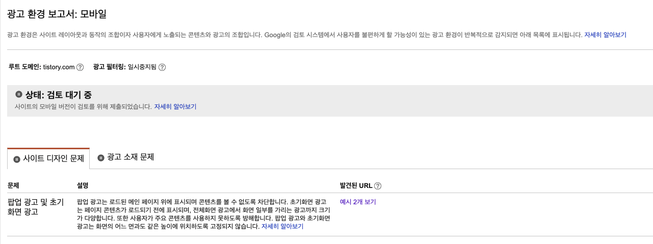 이제 해당 사이트에서 발생한 광고 환경 보고서를 확인할 수 있게 된다. 위에 선택한 속성을 보면 알 수 있듯 문제가 생겼던 사이트는 해당 티스토리 블로그였다. 최근에 업데이트한 스킨이 문제일까... 생각하면서 위반 사항을 자세히 살펴보았다.