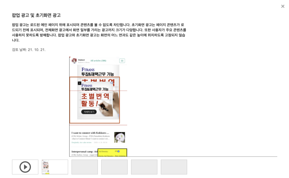 2021년 10월 21일 새벽 구글 애드센스에 더 나은 광고 표준(Better Ads Standard)에 위배되는 광고 경험이라는 구글 애드센스의 경고 알림이 떴다.