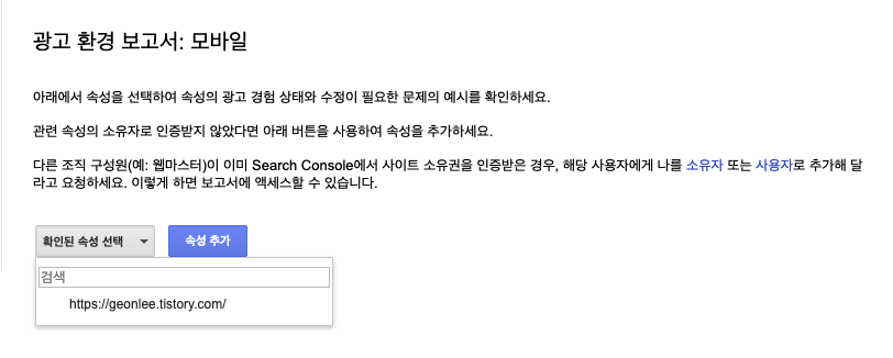 링크를 클릭하면 Web Tools에 있는 광고 환경 보고서로 이동시켜준다. 여기서 광고 환경 보고서 > 모바일 로 들어간다. 그리고 속성을 선택하는데 서치 콘솔에 소유권을 가진 사이트가 옵션으로 뜨게 된다. 해당 사이트를 클릭해보자.