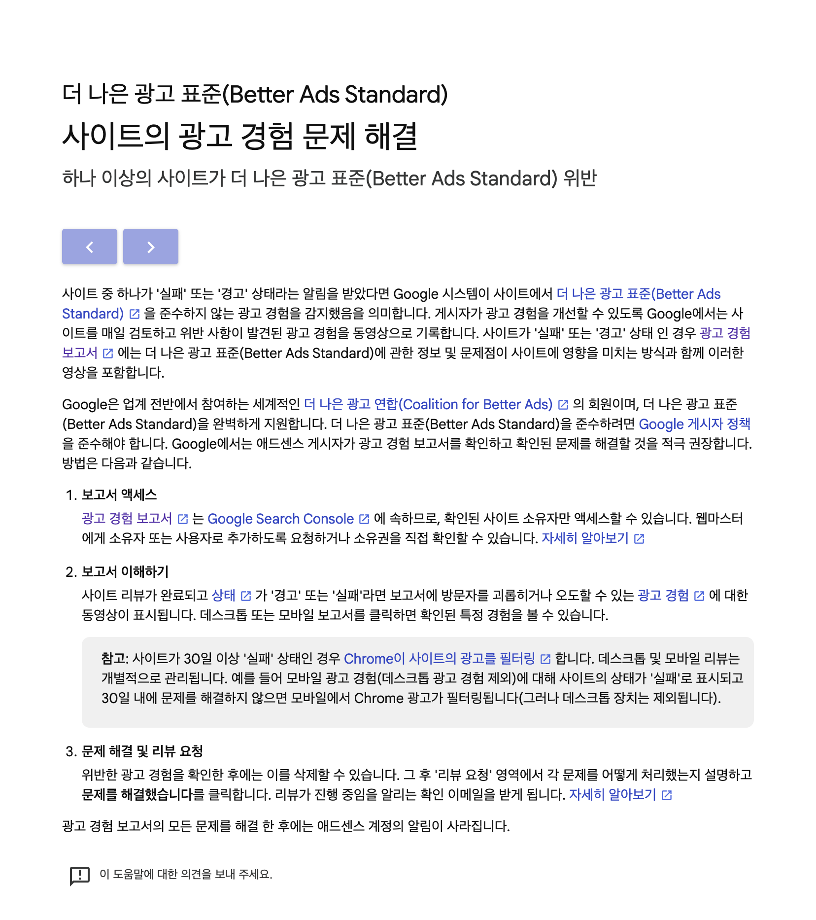 2021년 10월 21일 새벽 구글 애드센스에 더 나은 광고 표준(Better Ads Standard)에 위배되는 광고 경험이라는 구글 애드센스의 경고 알림이 떴다.
