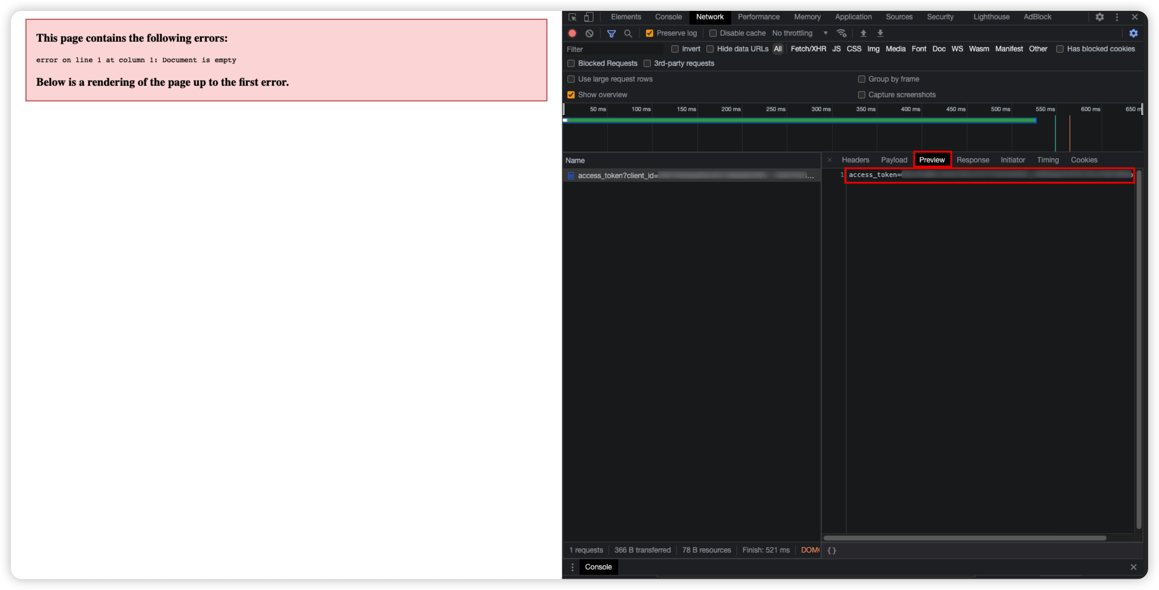 그럼 왼쪽 화면에는 랜더링할 페이지가 없다는 오류가 나오지만 오른쪽에는 요청으로 인한 값이 온것을 확인할 수 있습니다. 여기에서 Preview 탭을 클릭하면 발급된 access_token의 값을 확인할 수 있습니다. 이제 해당 토큰을 이용해서 내 블로그의 글을 조회하거나 작성할 수 있게 되었습니다. 이번 글에서는 코드는 사용하지 않고 브라우저를 이용한 요청으로만 확인해볼 예정이니 글 조회에 대한 요청을 해봅시다.