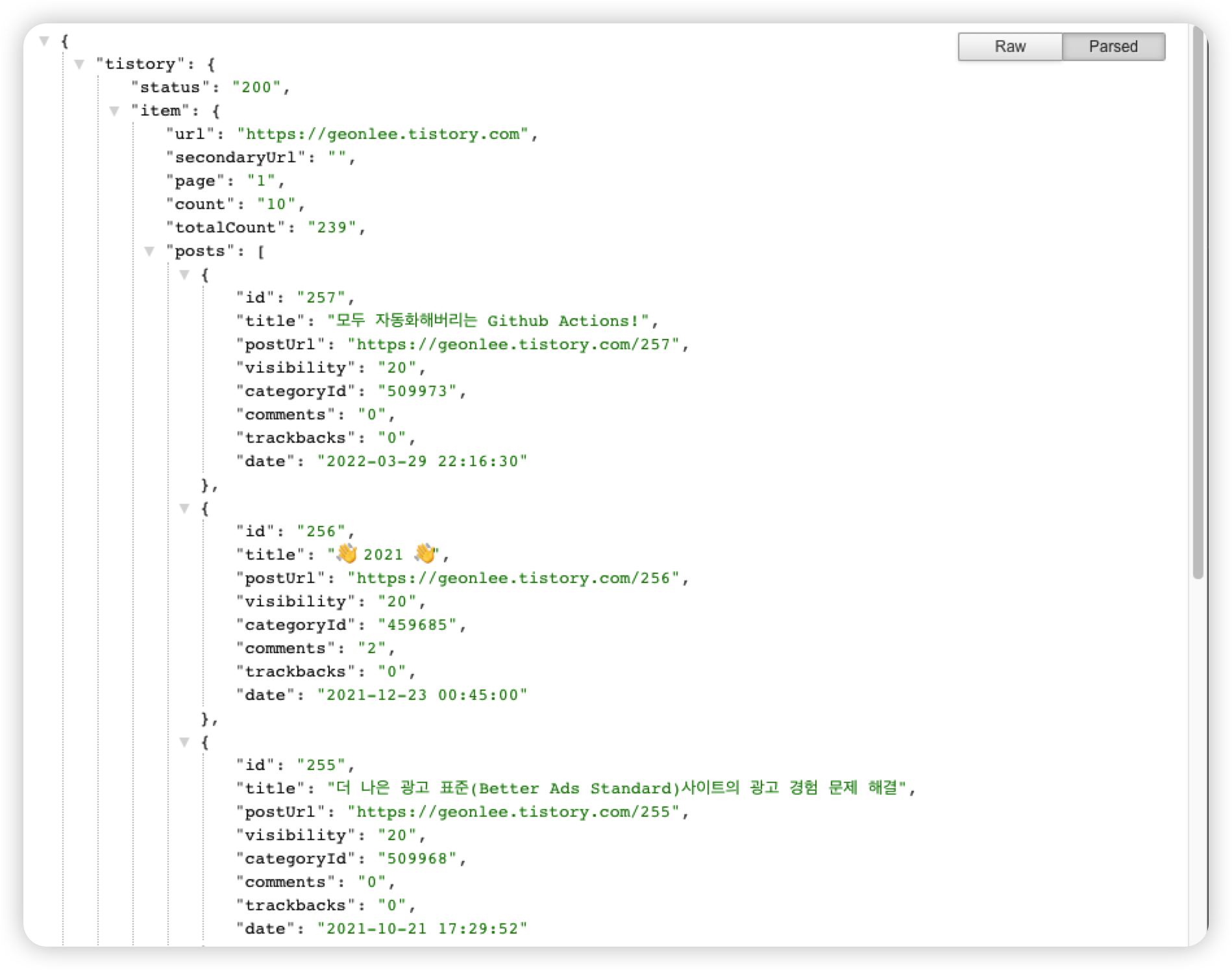 위와 같이 요청하면 내 블로그의 글 목록에 대한 값을 받아올 수 있습니다. 각 값에 대한 설명은 다음과 같습니다.