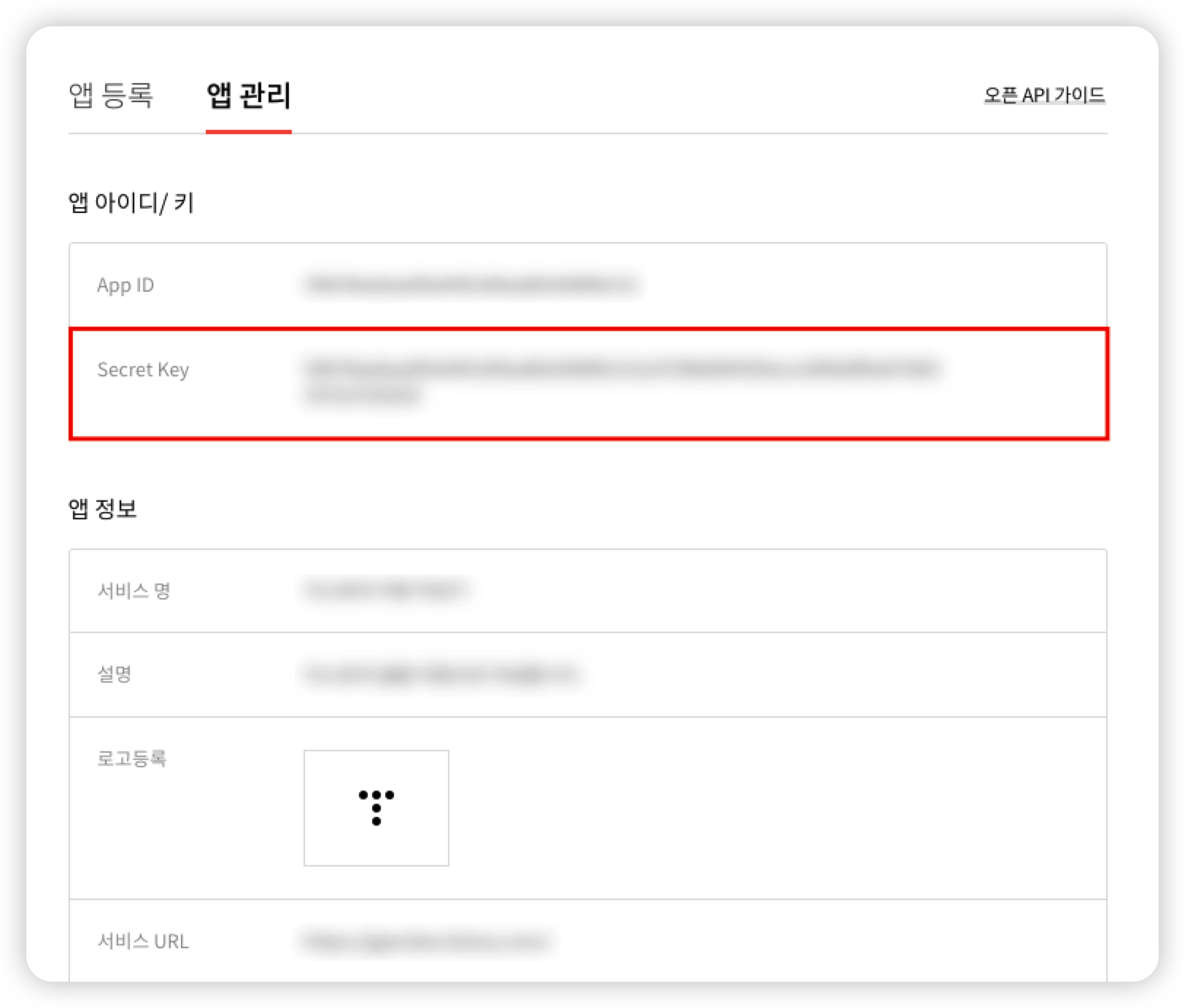 다른 영역은 앱 등록시 입력한 앱 정보가 보이고 우리에게 중요한 정보는 앱 아이디/키의 정보들입니다. 이제 이 정보들을 이용해서 Access Token을 받아봅시다.