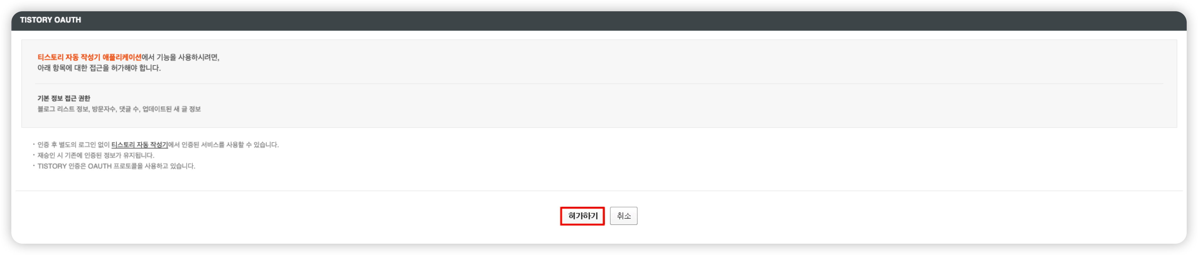 https://www.tistory.com/oauth/authorize?client_id=${App ID}&redirect_uri=${블로그 주소}&response_type=code