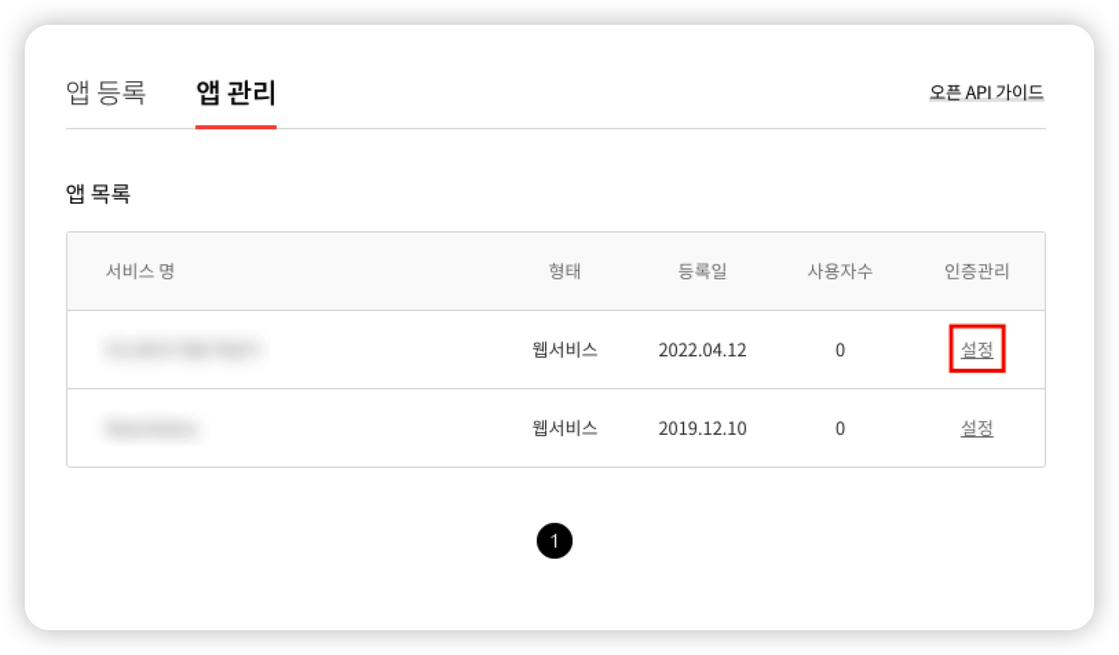 값을 다 넣었다면 등록을 눌러줍니다. 등록이 완료 되었다면 앱 관리 탭을 선택해서 등록된 앱을 확인해봅시다.