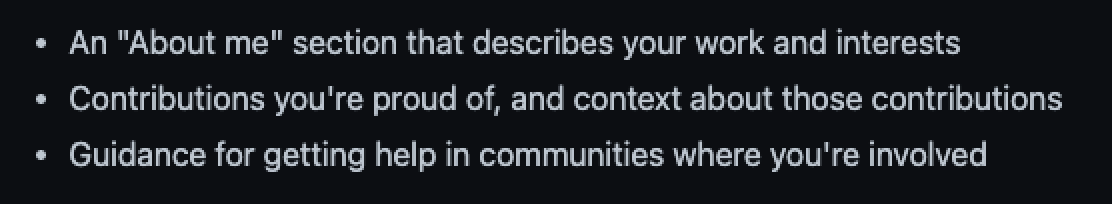 본인을 표현하기 위한 공간인 것은 알겠고, 그럼 무슨 내용으로 채울지 고민이 들 것이다. Github에서는 다음과 같은 내용이 들어가기를 권장하고 있다.