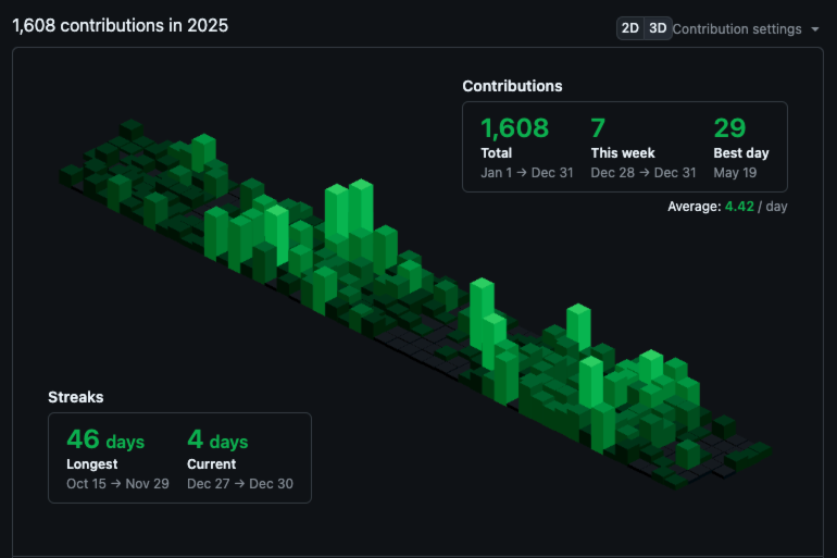 올 해, 회사에서의 어수선한 분위기에 머리를 식히고 집중할 곳이 필요해서, 일이 끝나면 언제나 사이드프로젝트를 잡았다. 그러다보니 정말 작업을 많이했는데, 찾아보니 작년은 458 commit 수준이였는데 올 해는 1600 commit이 넘는다. 물론 시간을 많이 투입한 것도 있지만, 올 해 사이드프로젝트로 AI 툴 PoC를 정말 많이 했다. Cursor를 정말 딥하게 써보고, Claude Code도 과금을 해서 몇 달간 써보기도 했다. 그러다보니 작업 속도도 빨라지고, 커밋 양도 자연스럽게 많아지게 된 것 같다.